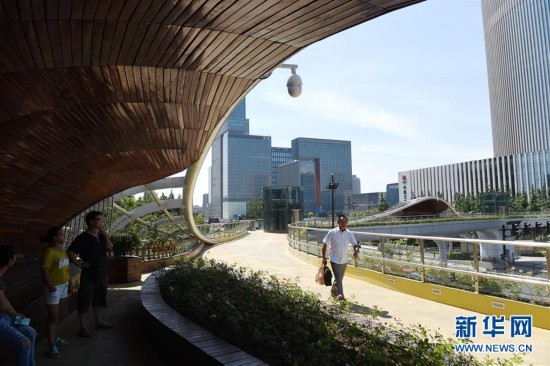 Aerial shots snapped on July 20 show the first ecological footbridge recently devoted into use in ?Hangzhou?, east ??China?’s Zhejiang province. Flower beds are seen arranged at the wider sections of the bridge, and the shell-shaped sheds allow pedestrians to stop for a rest. In addition, the four roadjoints will be later developed into corner gardens. (Photo/Xinhua)