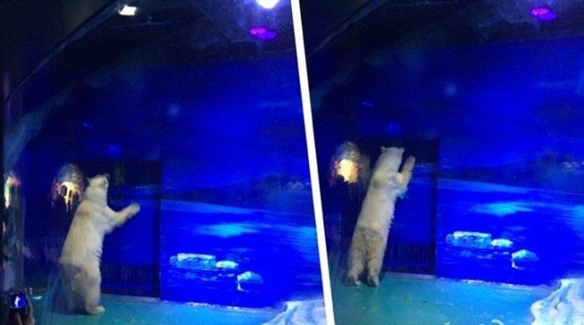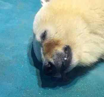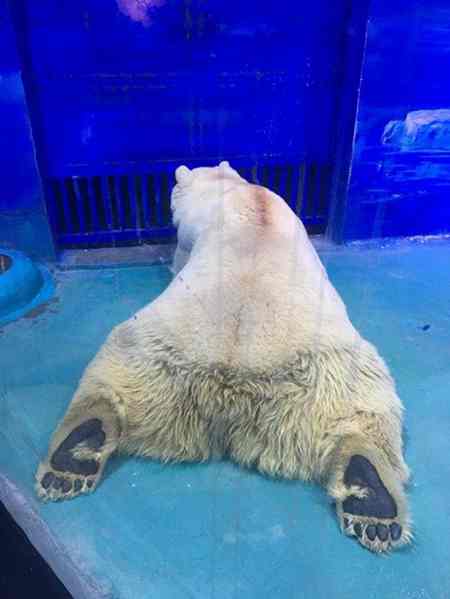 The lethargic bear, whose name is Pizza, is being exhibited at an ocean theme park within the shopping center. As the only polar bear in the park, Pizza lives in an aquarium of less than 40 square meters. Although the aquarium contains a pool, Pizza seldom spends time in the water. One more source of stress for the bear is the groups of visitors who tap on the glass behind which the polar bear is kept. Many also pose for selfies with Pizza.