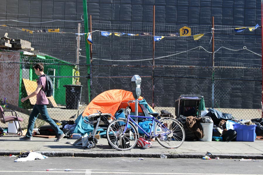 A student walks by a tent located at Shottwell St. At a range up to 20 meters, there are at least four more tents like this.