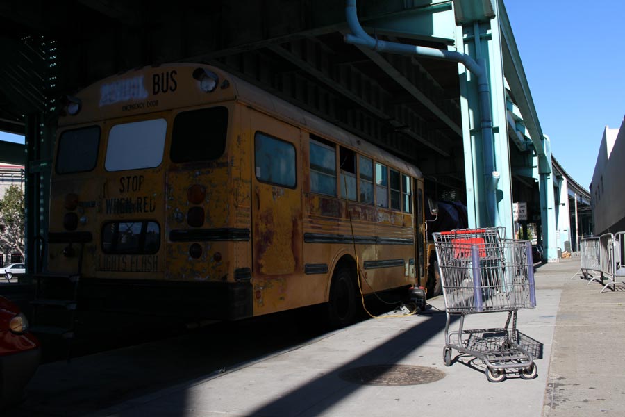An abandoned school bus is transferred into a temporary shelter for the homeless. According to Audrey Cooper, editor-in-chief of the San Francisco Chronicle, if including the people living in vehicles, the homeless population in San Francisco is far over 7,000.