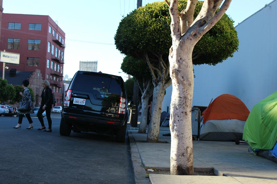 On the one side of Utah St. is Hosfelt Gallery. During the interview we see people parking their Infiniti, BMW, and Mercedez-Benz by the roadside walking into the gallery. On the other side of the street, over 10 tents are set up together, side by side.