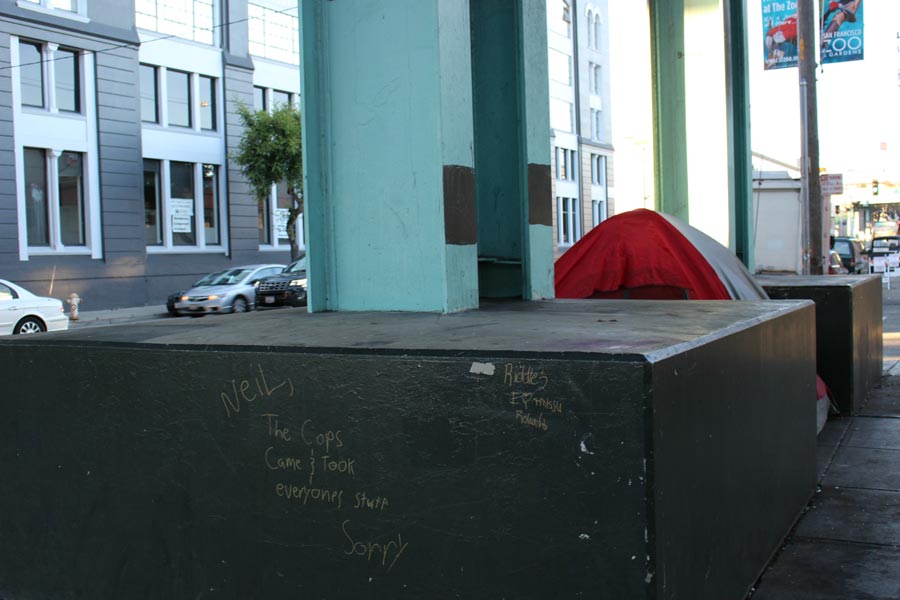 Under an overpass in Mission District, a note on the bridge foundation says “Neil, the cops came and took everyone’s stuff. Sorry.”