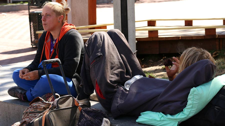 Rebecca (Left), 28, and her boyfriend Maxwell(Right), are resting in the shades at Civic Center Plaza, San FranciscoJuly. 19, 2016. (Photo by Xue Yujie)