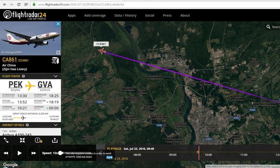 Russian newspaper site "vzglyad.ru" (ВЗГЛЯД.РУ) quoted witness's description and screenshot from flight tracker website Flightradar24, reporting that a total of four flights, all seemed to be civilian flights from China, appeared in the no-fly zone above Seversk on July 23.