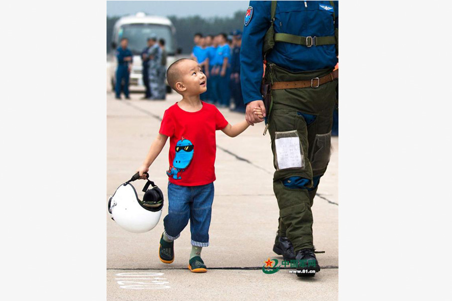 People's Liberation Army (PLA) Air Force pilots are greeted by their children and other family members after returning from an air force competition meant to test pilots' combat ability in both air-to-ground and air-to-sea situations. (Photo source: 81.cn)