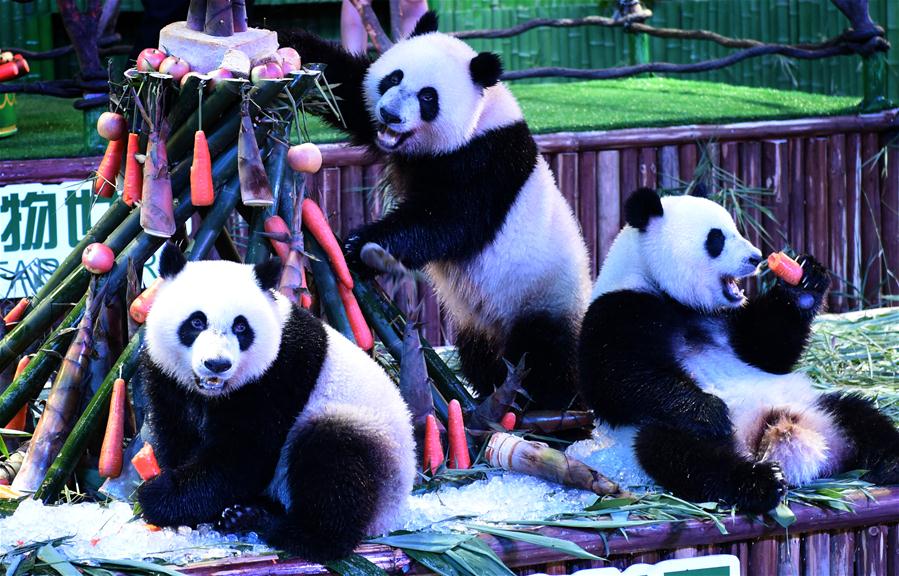 Giant panda triplets Mengmeng, Shuaishuai and Kuku eat bamboo shoots and carrots at their birthday party in in Guangzhou, capital of south China's Guangdong Province, July 29, 2016. A party celebrating the second birthday of the world's only surviving panda triplets, who were born on July 29, 2014 in Guangzhou, was held at Chimelong Safari Park here Friday. (Xinhua/Lu Hanxin)