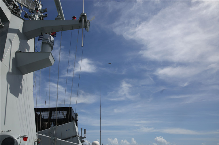 A helicopter flies over the guided-missile frigate Zhuzhou (Hull Number 594) to conduct a live-fire anti-submarine operation in the East China Sea on Aug 1, 2016. The helicopter is attached to an aviation troop with the East China Sea Fleet of the PLA Navy. (81.cn/ Wu Shangrui)