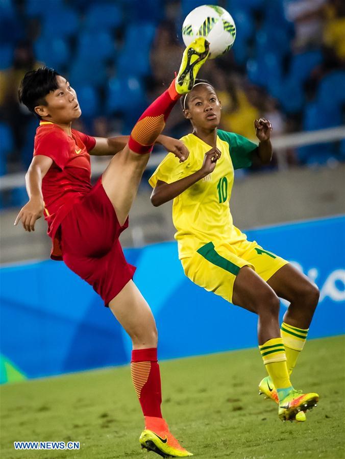 Gao Chen (L) of China vies for the ball against South Africa's Linda Motlhalo during a Group E match of women's football at the 2016 Rio Olympic Games in Rio de Janeiro, Brazil, on Aug. 6, 2016. China defeated South Africa 2-0. (Xinhua/Liu Bin)