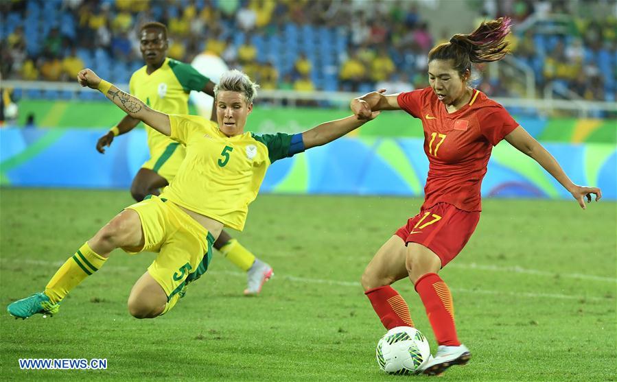 Gu Yasha (R) of China shoots the ball against South Africa's Janine van Wyk during a Group E match of women's football at the 2016 Rio Olympic Games in Rio de Janeiro, Brazil, on Aug. 6, 2016. China defeated South Africa 2-0. (Xinhua/Lui Siu Wai)