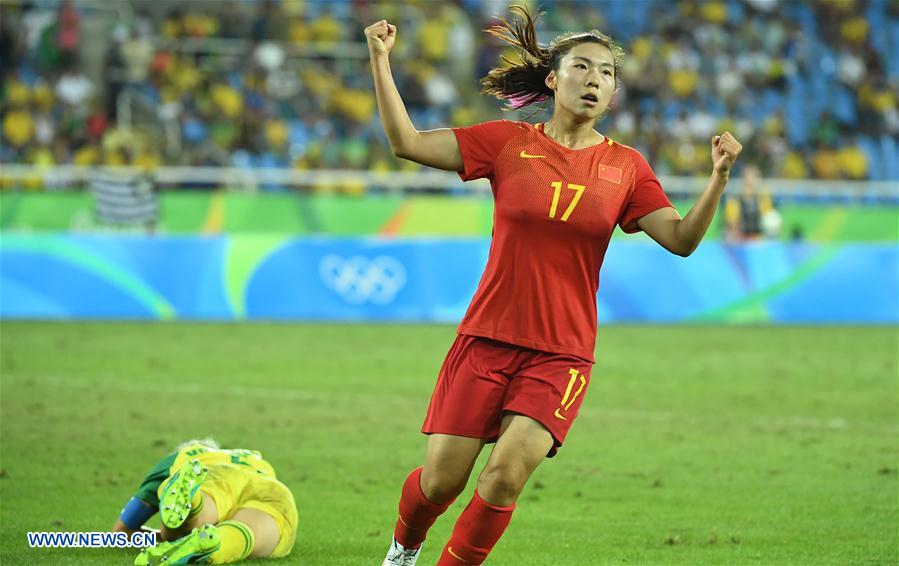 Gu Yasha of China celebrates for a goal during a Group E match of women's football at the 2016 Rio Olympic Games in Rio de Janeiro, Brazil, on Aug. 6, 2016. China defeated South Africa 2-0. (Xinhua/Lui Siu Wai)