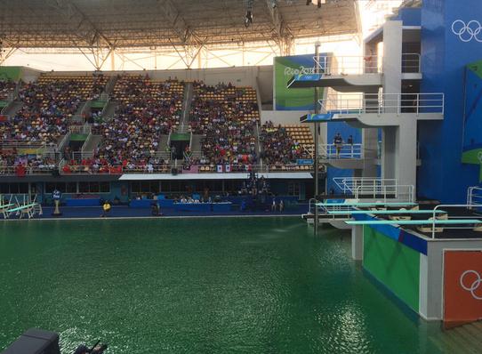 Photo taken on August 9, 2016 shows the green water in the diving pool of the Rio Olympic Games. [Photo: sohu.com]