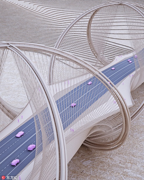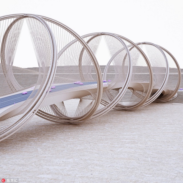 Chirs Precht, co-founder of Penda says it is helpful to view the apparatus in a similar way as a bicycle wheel. There are 300-foot tall steel rings tilt toward each other in pairs, and the deck and cables are the hub and spokes of the wheel, respectively. Moreover, the structure aims to provide a public space, with transportation lanes and the pedestrian lanes seperated by a natural stripe of hedges and trees.