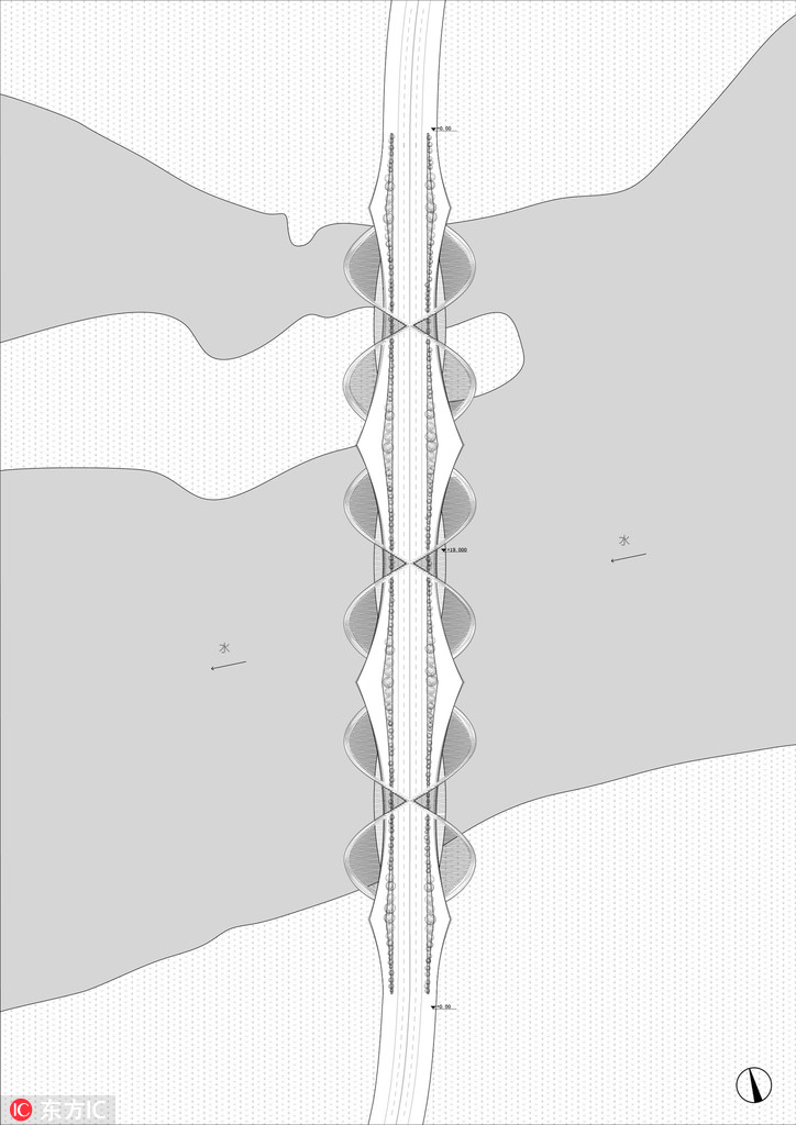The bridge, named San Shan Bridge, is a project of Beijing and Vienna based architecture studio Penda. The inspiration is a combination of the Olympic symbol and its five rings, the landscape of mountains and valleys, and the structural resemblance of the bridge to the shape of a DNA.