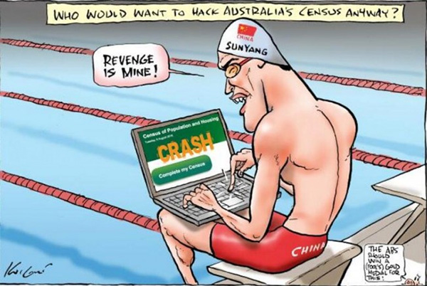 In the comic, Chinese Olympic swimmer Sun Yang is depicted as a hacker, hacking his way onto the census website. Wearing China’s national swimming cap and swim trucks, a thought bubble shows Sun thinking, "Revenge is mine!" as he types on the keyboard. In the bottom right corner of the comic is the sentence, "The ABS [Australian Bureau of Statistics] should win a (fool's) gold medal for this!"