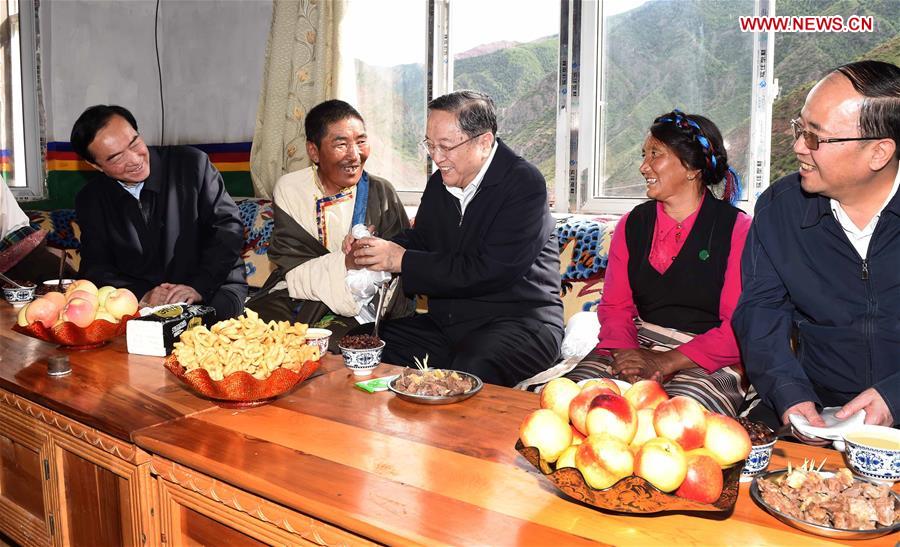 Yu Zhengsheng (C), chairman of the National Committee of the Chinese People's Political Consultative Conference (CPPCC), visits the home of a villager in Darog Village of Karub District in Qamdo, southwest China's Tibet Autonomous Region, Aug. 12, 2016. Yu made an inspection tour in Qamdo from Aug. 12 to 13. (Xinhua/Zhang Duo)
