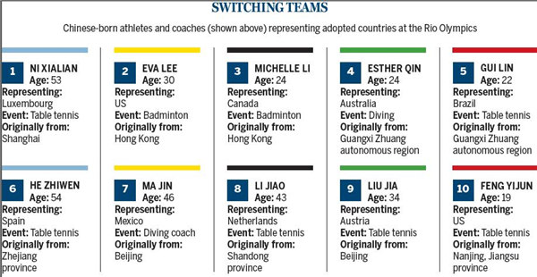 The two oldest table tennis players at the Rio Olympics — He Zhiwen, 54, and Ni Xialian, 53 — were among the first generation of national team players who became naturalized citizens of European nations. The Chinese media dubbed them "the foreign legion".
