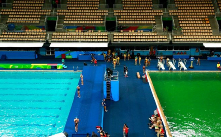 The green water in the diving pool of the Maria Lenk Aquatics Center in Rio. (Photo/Xinhua)