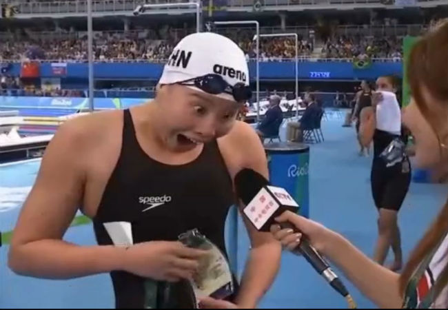 Fu made headlines internationally with her charming response to winning a medal in the women's 100-meter backstroke, exclaiming "I'm so fast!"and joking that she used her "prehistoric powers" to win. Later, she admitted that her performance in another event was hampered by the fact she had started her period the night before.