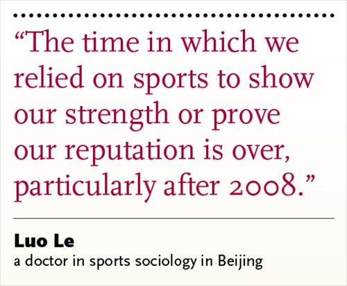 Many media reports have explained this change in terms of the country's international standing, claiming that China has gained confidence to the point where it can discard its previous focus on medals. "The time in which we relied on sports to show our strength or prove our reputation is over, particularly after 2008," said Luo Le, a doctor in sports sociology in Beijing.