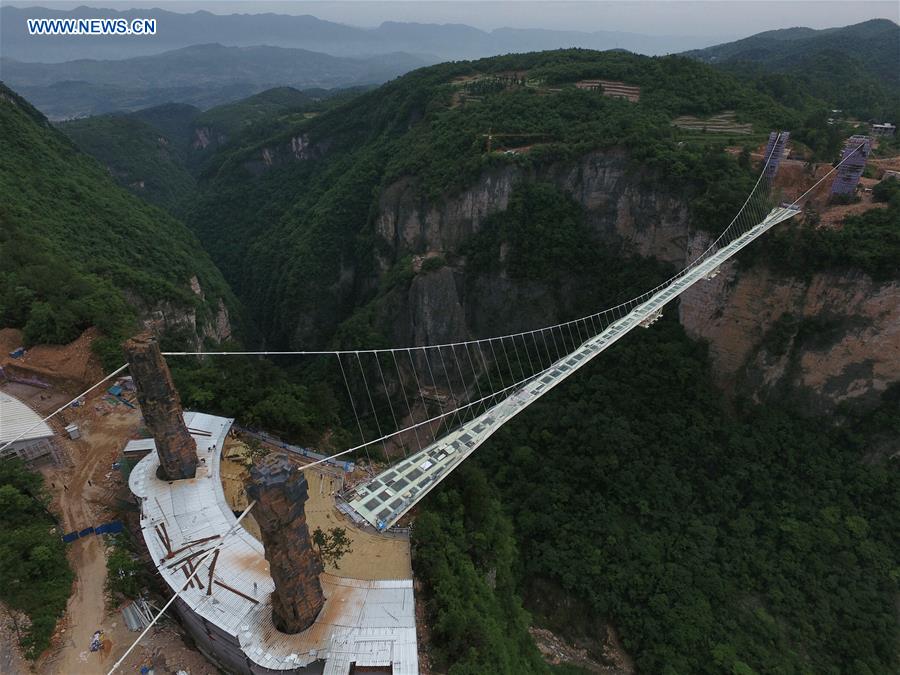 An aerial photo taken on May 17, 2016 shows the construction site of a glass bridge at the Grand Canyon of Zhangjiajie National Forest Park, central China's Hunan Province. The 430-meter-long, 6-meter-wide bridge is expected to be put into a trial operation in May. The structure has undergone nearly 100 safety tests to ensure that it can support the weight of 800 people. (Xinhua/Long Hongtao)