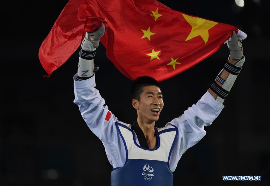 China's Zhao Shuai celebrates after men's -58kg gold medal contest of Taekwondo at the 2016 Rio Olympic Games in Rio de Janeiro, Brazil, on Aug. 17, 2016. Zhao Shuai won the gold medal. (Xinhua/Han Yuqing)