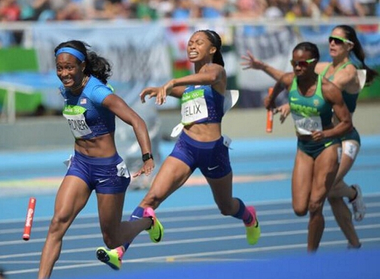 Allyson Felix of the US team bungled the second baton exchange but the defending champion appealed that the four-timeOlympic gold medalist had been bumped by a Brazilian athlete before the handover.