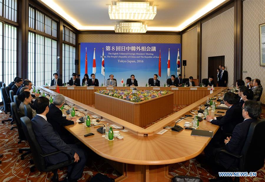 The 8th trilateral foreign ministers' meeting is held in Tokyo, Japan, Aug. 24, 2016. Chinese Foreign Minister Wang Yi, Japanese Foreign Minister Fumio Kishida and South Korean Foreign Minister Yun Byung Se attended the meeting. (Xinhua/Ma Ping)