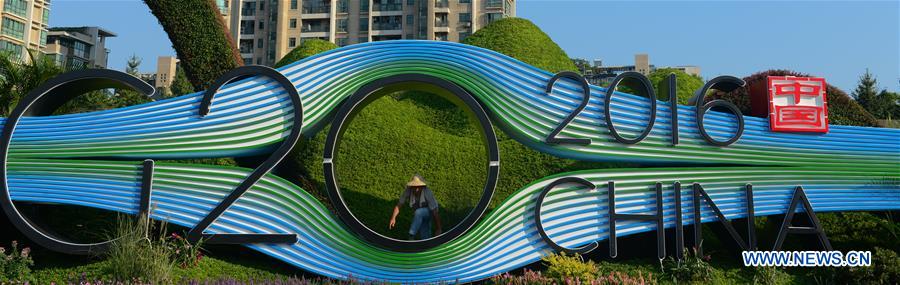 A gardener maintains a G20 themed flower terrace at Jiangnan Avenue in Binjiang District of Hangzhou, capital of east China's Zhejiang Province, Aug. 25, 2016. The G20 Summit will be held in Hangzhou on Sept. 4 to 5. (Xinhua/Yin Dongxun)