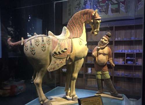 A Tri-color glazed art piece from the Tang Dynasty, the name comes from the yellow, green, and white colors used by the artists.