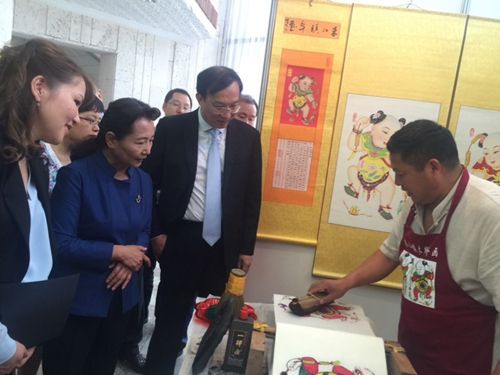 China-Kazakhstan cultural event held in Almaty, Kazakhstan. The exhibition brings some of the beauty and wonder of the East to Kazakhstan: tri-color glazed art pieces from the Tang Dynasty, Jun and Ru wares, Zhuxian xylography, paper cutting, gourd pyrography, clay figurines, dough modeling, and sugar figurines, as well as folk performances.