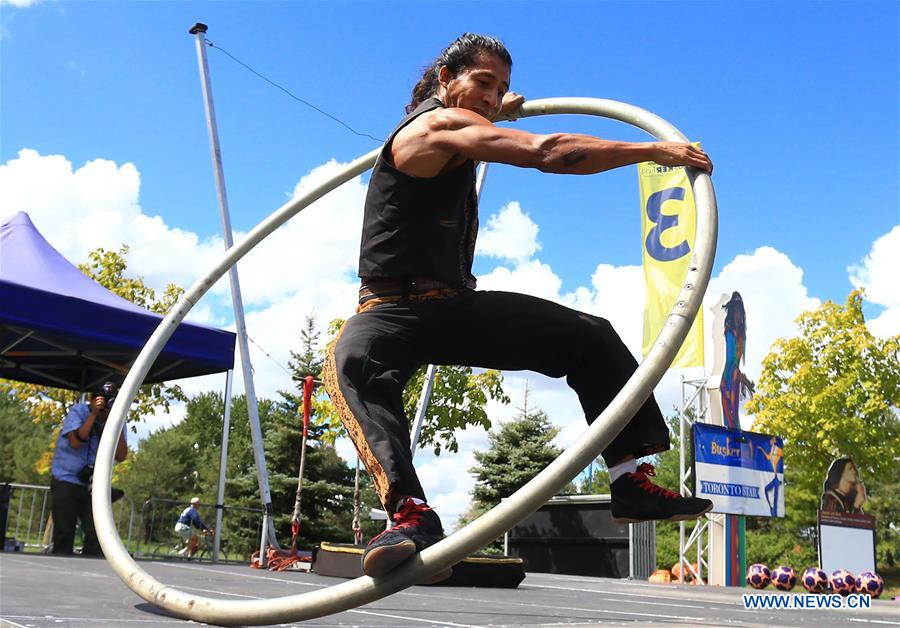 Acrobat Pancho Libre from Mexico performs during the media day sneak peek of the 17th annual Toronto International BuskerFest at Woodbine Park in Toronto, Canada, Sept. 1, 2016. Featuring hundreds of best street performers from around the world, the annual street busker festival is expected to draw millions of spectators and help raise funds for Epilepsy Toronto. (Xinhua/Zou Zheng)