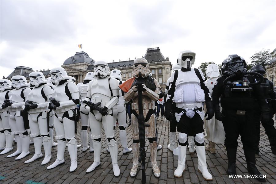 People dressed as Star Wars stormtroopers take part in the Balloon's Day Parade during comic strip festival "Fete de la BD" in downtown Brussels, Belgium, Sept. 4, 2016. (Xinhua/Ye Pingfan)