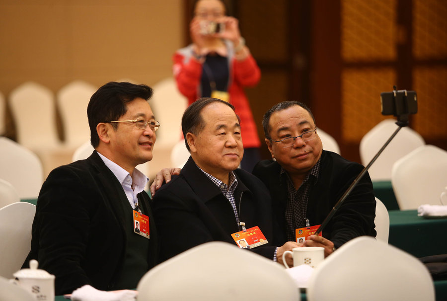 CPPCC member and Nobel laureate Mo Yan, center, takes a selfie with director Yin Li, right, and conductor Yu Hai, left, who are both CPPCC members, at a seminar on March 7, 2015. [File Photo]