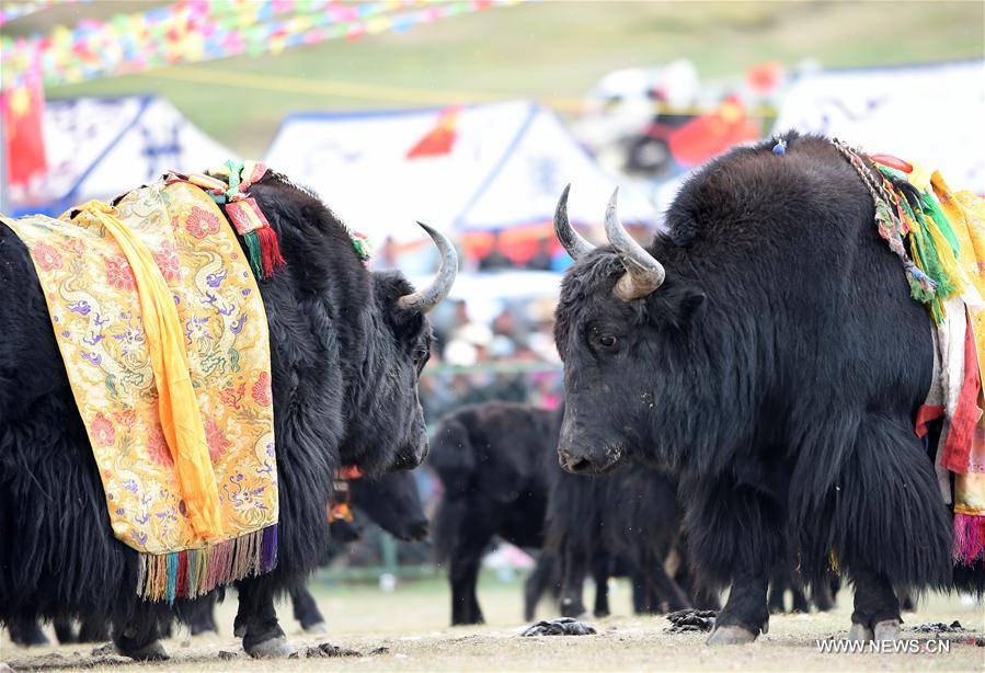 Yaks fight during a bullfighting festival in a township of Xigaze City, southwest China's Tibet Autonomous Region, Sept. 8, 2016. A bullfighting festival was held on the Damxung Grassland in Xigaze on Thursday. (Xinhua/Chogo)