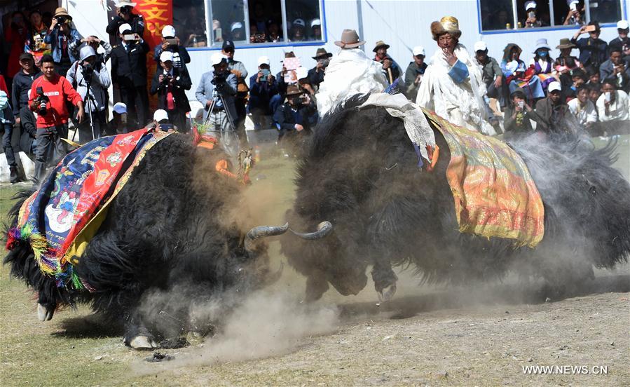 Yaks fight during a bullfighting festival in a township of Xigaze City, southwest China's Tibet Autonomous Region, Sept. 8, 2016. A bullfighting festival was held on the Damxung Grassland in Xigaze on Thursday. (Xinhua/Chogo)