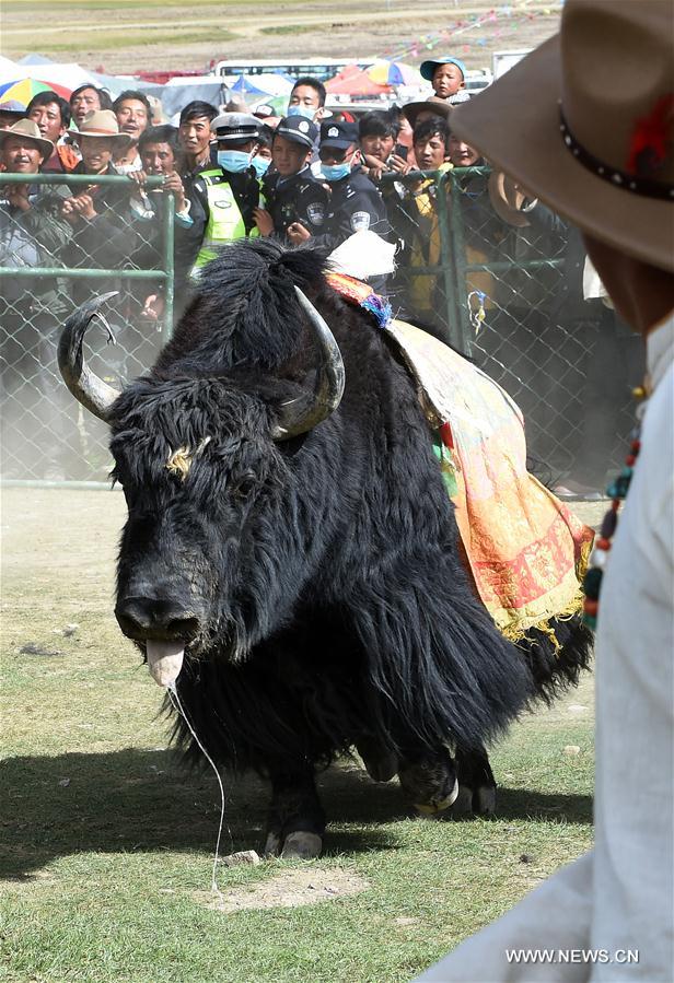 A yak wins during a bullfighting festival in a township of Xigaze City, southwest China's Tibet Autonomous Region, Sept. 8, 2016. A bullfighting festival was held on the Damxung Grassland in Xigaze on Thursday. (Xinhua/Chogo)