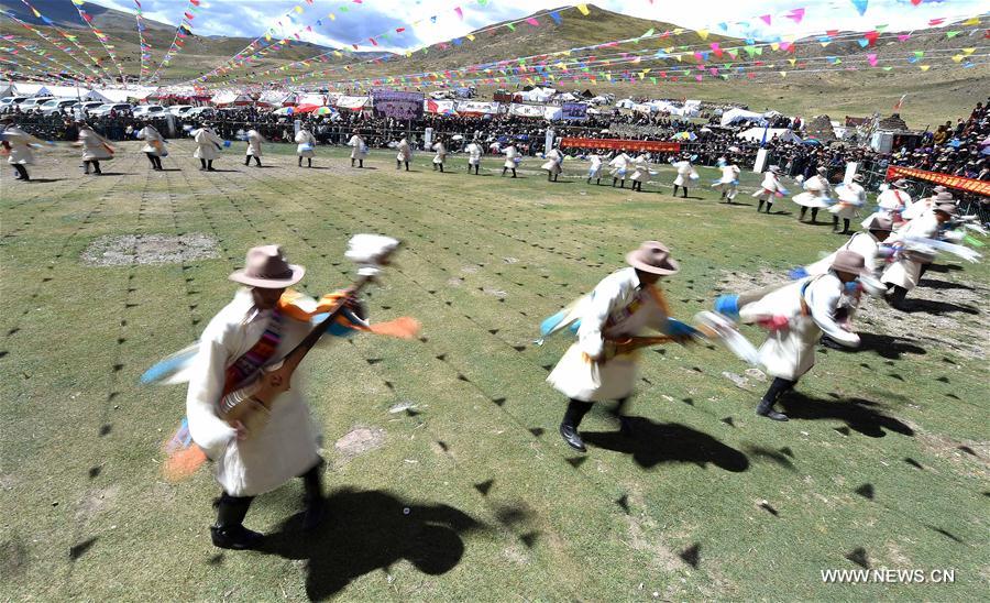 Tibetan people perform during a bullfighting festival in a township of Xigaze City, southwest China's Tibet Autonomous Region, Sept. 8, 2016. A bullfighting festival was held on the Damxung Grassland in Xigaze on Thursday. (Xinhua/Chogo)