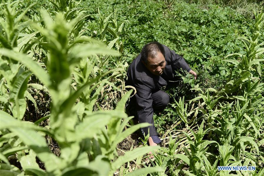 The 56-year-old teacher Hua Fulin, the only teacher of the small school in Kunlun Village, weeds in the school yard where he grows some vegetable plants, in Kunlun Village of Haidong City, northwest China's Qinghai Province, Sept. 8, 2016. About 50 kilometers away from the nearest county, the Kunlun small school now has only eight students and one teacher. (Xinhua/Zhang Hongxiang)
