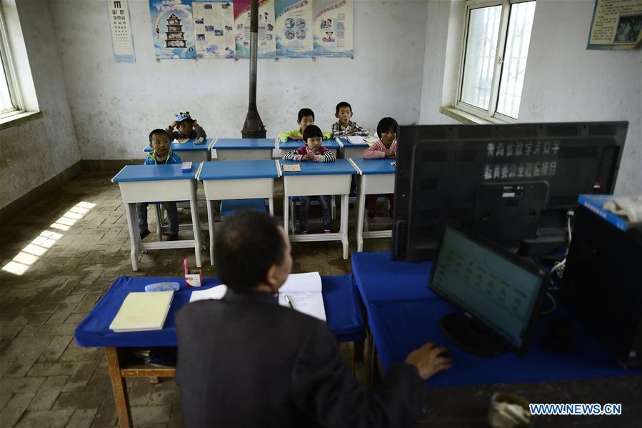 The 56-year-old teacher Hua Fulin, the only teacher of the small school in Kunlun Village, instructs his students, in Kunlun Village of Haidong City, northwest China's Qinghai Province, Sept. 8, 2016. About 50 kilometers away from the nearest county, the Kunlun small school now has only eight students and one teacher. (Xinhua/Zhang Hongxiang)