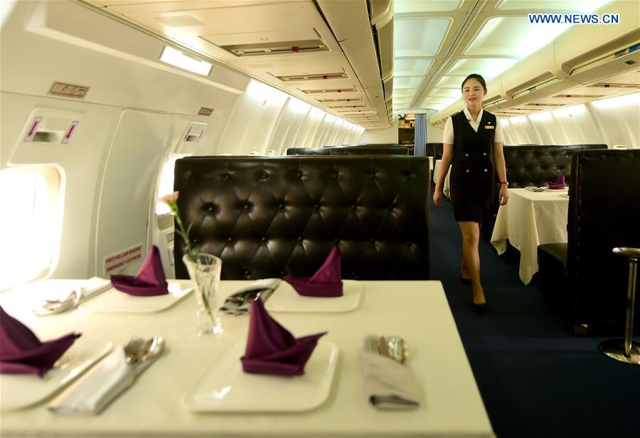 Photo taken on Sept. 9, 2016 shows the interior of the plane restaurant in Wuhan, capital of central China's Hubei Province. The restaurant, a retired aircraft bought from an Indonesian airline, can accommodate 70 customers after renovation. (Xinhua/Rao Rao)