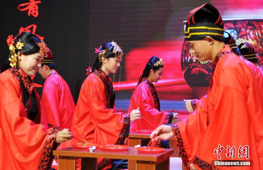 To promote green weddings and traditional Chinese culture, Shimen experimental school in Shijiazhuang, north China's Hebei province, held a collective wedding for 12 newlyweds on Teachers' Day, September 10, 2016. The couples wore the traditional Hanfu dress and consisted of at least one teacher from the school. [Photo: Chinanews.com]