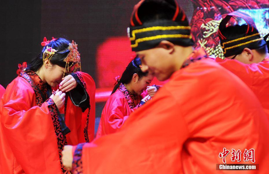To promote green weddings and traditional Chinese culture, Shimen experimental school in Shijiazhuang, north China's Hebei province, held a collective wedding for 12 newlyweds on Teachers' Day, September 10, 2016. The couples wore the traditional Hanfu dress and consisted of at least one teacher from the school. [Photo: Chinanews.com]