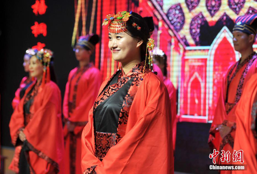 To promote green weddings and traditional Chinese culture, Shimen experimental school in Shijiazhuang, north China's Hebei province, held a collective wedding for 12 newlyweds on Teachers' Day, September 10, 2016. The couples wore the traditional Hanfu dress and consisted of at least one teacher from the school. [Photo: Chinanews.com]