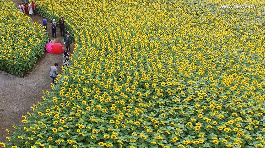 Tourists enjoy themselves amid sunflowers at a park in Heping District in Shenyang, capital of northeast China's Liaoning Province, Sept. 12, 2016. (Xinhua/Yang Qing)