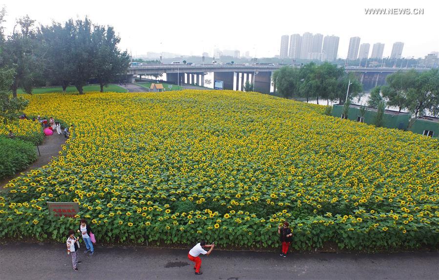 Tourists enjoy themselves amid sunflowers at a park in Heping District in Shenyang, capital of northeast China's Liaoning Province, Sept. 12, 2016. (Xinhua/Yang Qing)