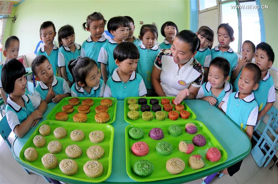A teacher introduces knowledge of moon cakes to children ahead of the Mid-Autumn Festival at No. 2 Kindergarten of the Qiaodong District of Xingtai, north China's Hebei Province, Sept. 13, 2016. Chinese have the tradition to eat moon cakes at the Mid-Autumn Festival, which falls on Sept. 15 this year. (Xinhua/Zhu Xudong)