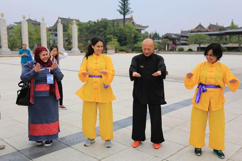 Li Wanfeng, chief coach at Emei Martial Arts Development Center, takes his foreign students from Egypt, Mexico and Chile to experience Tai Chi. [Photo provided to people.cn]