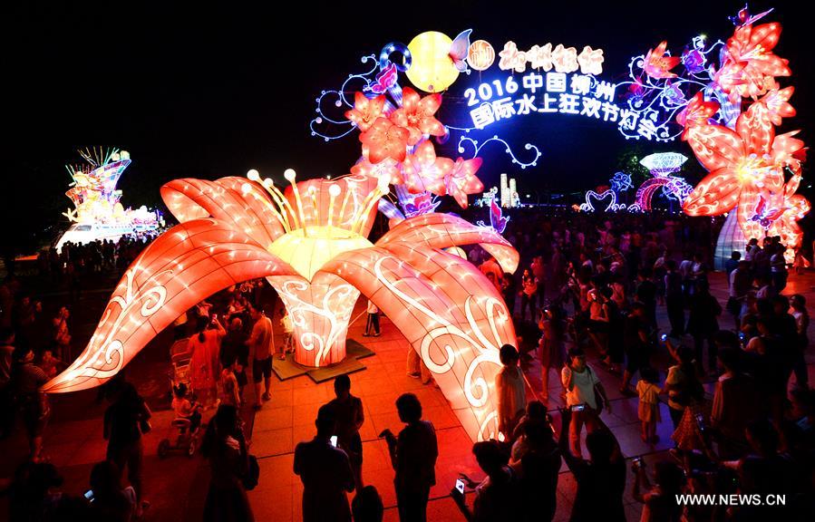 Visitors view colorful lanterns at a lantern fair for the Liuzhou international water carnival in Liuzhou, south China's Guangxi Zhuang Autonomous Region, Sept. 12, 2016. (Xinhua/Li Hanchi)