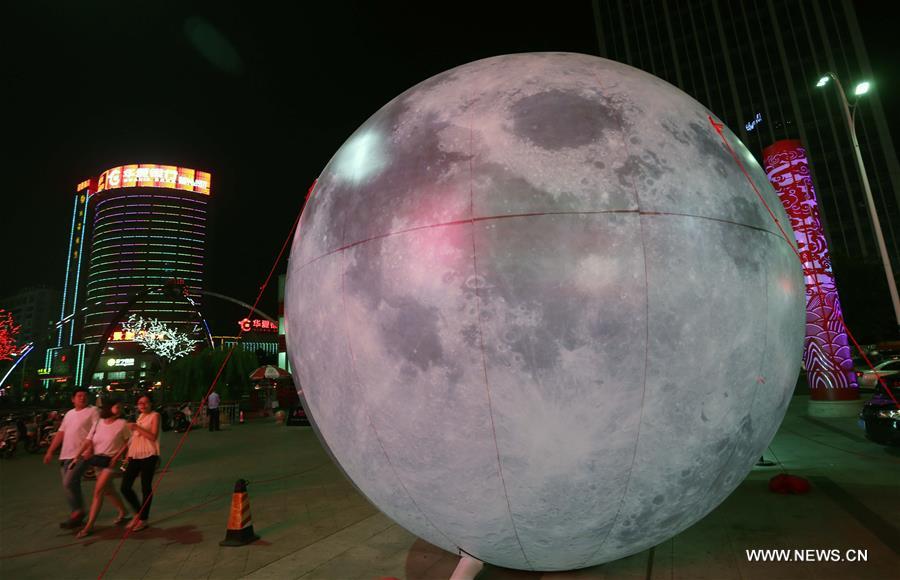People walk past a man-made moon in Weifang City, east China's Shandong Province, Sept. 12, 2016. The artificial moon with a 5-meter diameter was erected to greet the Chinese traditional Mid-Autumn Festival, which falls on Sept. 15 this year. (Xinhua/Zhang Chi)
