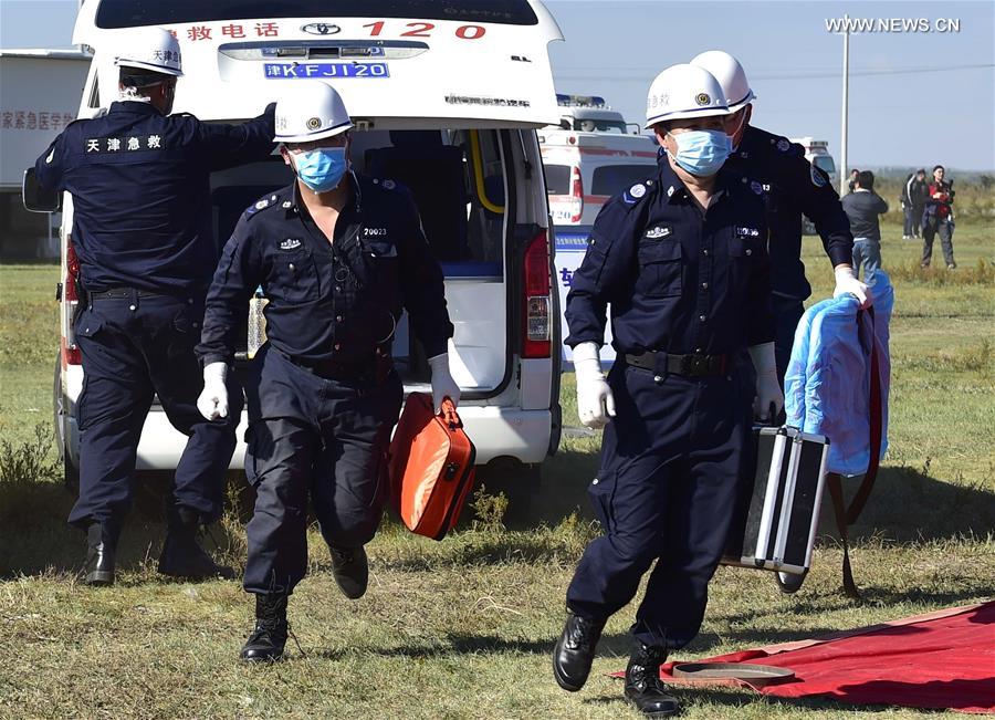 Medics run to the mock injured victim in an joint medical exercise on severe natural disasters in Zhangbei County of Zhangjiakou City, north China's Hebei Province, Sept. 13, 2016. Commissions of Health and Family Planning from Beijing City, Tianjin City and Hebei Province launched a joint medical emergency exercise on Tuesday. (Xinhua/Lian Yi)